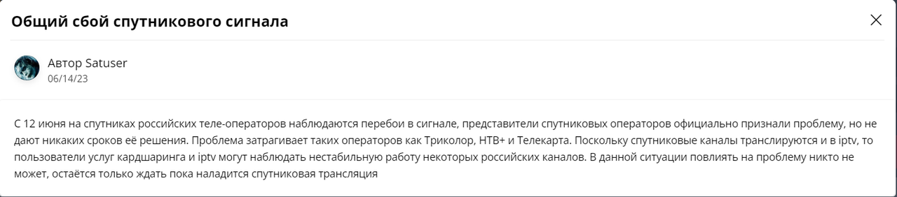 Да, было официальное уведомление от Ростелекома вроде, точно не помню, что с 4 июня наблюдаются атаки на росссийские вещательные каналы, операторы проводят технические работы по переводу вещания с арендованных у Франции спуников на российские