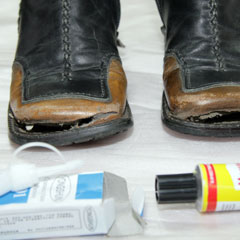 Мы решили проверить эти клеи на склеивании пары драных женских сапожек. Склеивали согласно инструкции на тюбиках. Перед тем как склеить один сапог «Моментом», мы слегка зачистили поверхность кожи шкуркой. Затем на обе поверхности тонким слоем нанесли клей и дали ему «потомиться» 20 минут. Спустя четверть часа клей практически впитался в обувь. Он стал вязким, а по липкости напоминал смолу хвойных деревьев. В инструкции по применению клея «Момент» было сказано, что при склеивании решающее значение имеет сила, а не продолжительность давления. Поэтому мы изо всей силы сжали подошву и носок сапога на пару секунд, после чего дали сапогу постоять сутки.