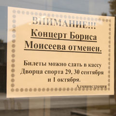 - В письме, которое прислали нам организаторы гастролей, причиной отмены концерта была названа «реакция общественных объединений к персоне артиста», - сообщила «НГ» в день концерта, 29 сентября, главный администратор Ледового дворца Наталья ГРЯЗНОВА. - В телефонном разговоре компания сослалась также на то, что было распродано менее 50% билетов - около 750-ти. Возвращаем людям деньги, все возмущены.