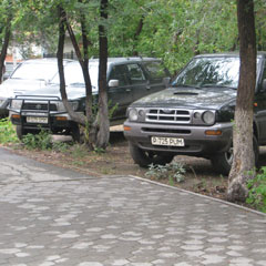 - Между жилым домом №122 по пр. Аль-Фараби и зданием областной телерадиокомпании расположена тополиная роща. Она всегда была нейтральной полосой между домом и телерадиокомпанией. Через тополиную аллею проходит тропа, по которой люди с пр. Аль-Фараби сразу могут пройти на ул. Железнодорожную. Но ходить по ней в последнее время стало весьма проблематично. На первом этаже жилого дома по пр. Аль-Фараби находится частная фирма, сотрудники которой оставляют свои автомобили прямо между тополями.
