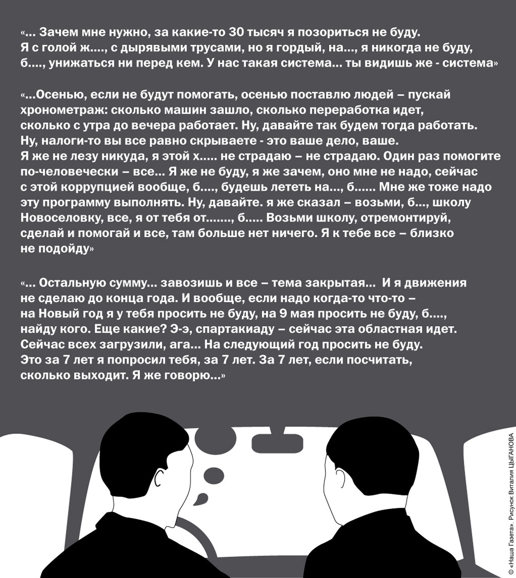 «...я же не прошу, ты мне не давай, я у тебя не просил и просить не буду, надо школу делать, делайте школу... План вот газеты «Козкарас», вот я пишу «Асар» 100 газет... отчитываюсь... 50 газет участникам... у меня 2000 пенсионеров. Распоряжение Кулагина - каждому обратить внимание. Мы решили постановлением - кому за 75 лет, тому мы покупаем газеты. Байгобилов сейчас 55 000 дает,... относит и закрывает мне газету... Каждый год Симаненко 100 000 дает на газеты... можешь пойти в редакцию проверить, Семейкин 100 000 дает каждый год, это беспроблемно, у них в обязанности вошло. Как начинается с вами - вы проблема...»