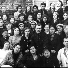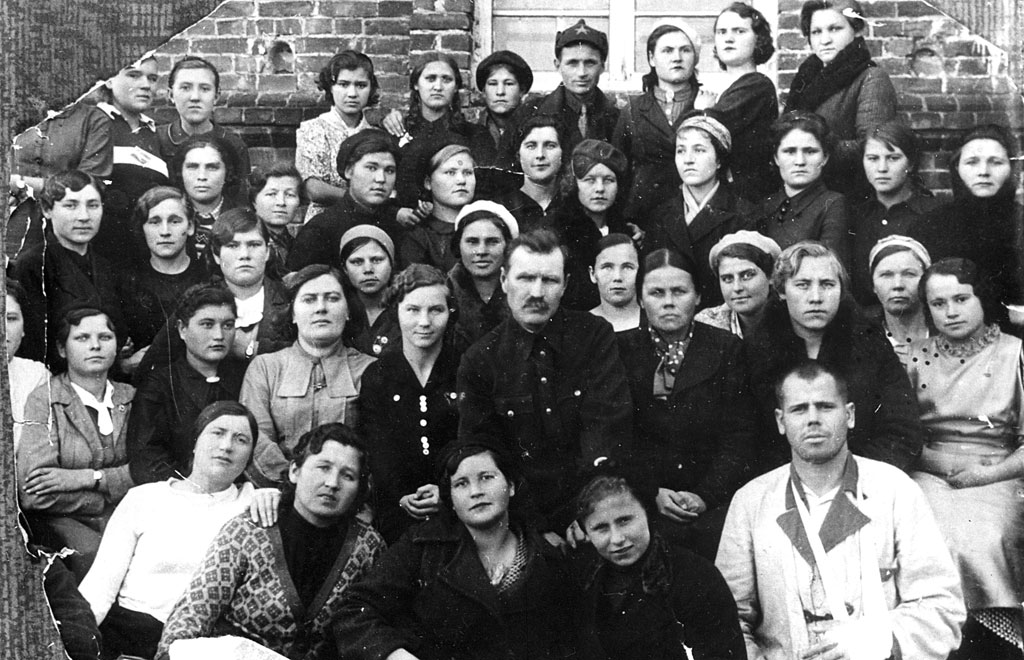 Курсанты курсов медсестер госпиталя № 3597 с первым раненым, поступившим в госпиталь. Кустанай, 1942 г.