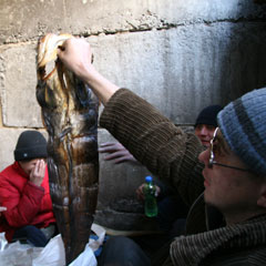 Последствия бродячей жизни четко видны на лице Ришата, который уже 1,5 года живет в тепловом люке на пересечении ул. Павлова и Баймагамбетова. В этот раз в люке мужчина был не один. К нему пришли в гости многодетная мать Сауле и еще два мужчины, которые представиться отказались. Среди гор мусора компания распивала бодяжный спирт и закусывала копченым сомом. Свой люк Ришат искал долго. Заселился после того, как оттуда достали два трупа. За 1,5 года не раз его обиталище забрасывали мусором и поджигали. Но Ришат не падает духом: