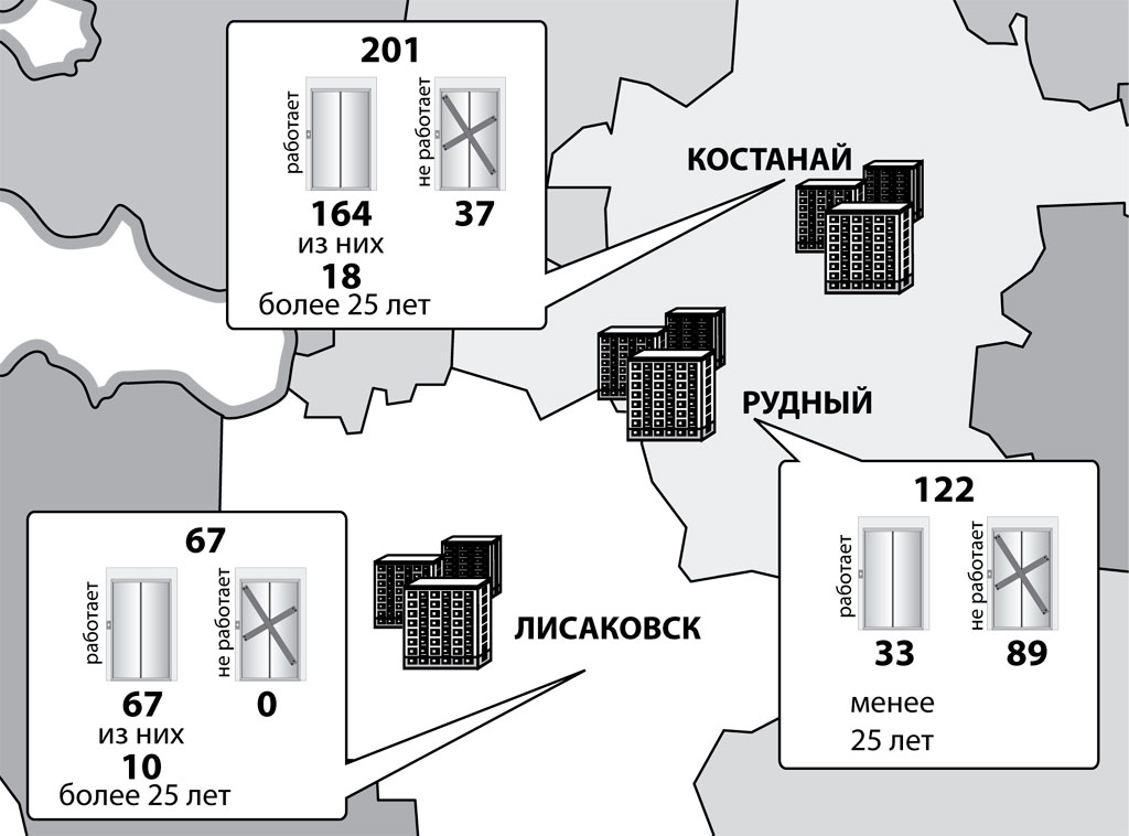В Казахстане участились несчастные случаи, связанные с неисправными лифтами. Нынешней осенью в Караганде актриса местного театра упала в шахту пустующего лифтового колодца. Несколько лет назад также погибла женщина в Костанае. Ни один из 201 лифта Костаная капитально не ремонтировался со времени установки. Хотя нормативный срок их эксплуатации 25 лет, после чего необходима полная замена лифта. Отслуживших свой срок подъемников в Костанае, по данным ЧС, - 34, по информации ТОО «Кустанайлифтинвест» - еще больше. Все они потенциально опасны.