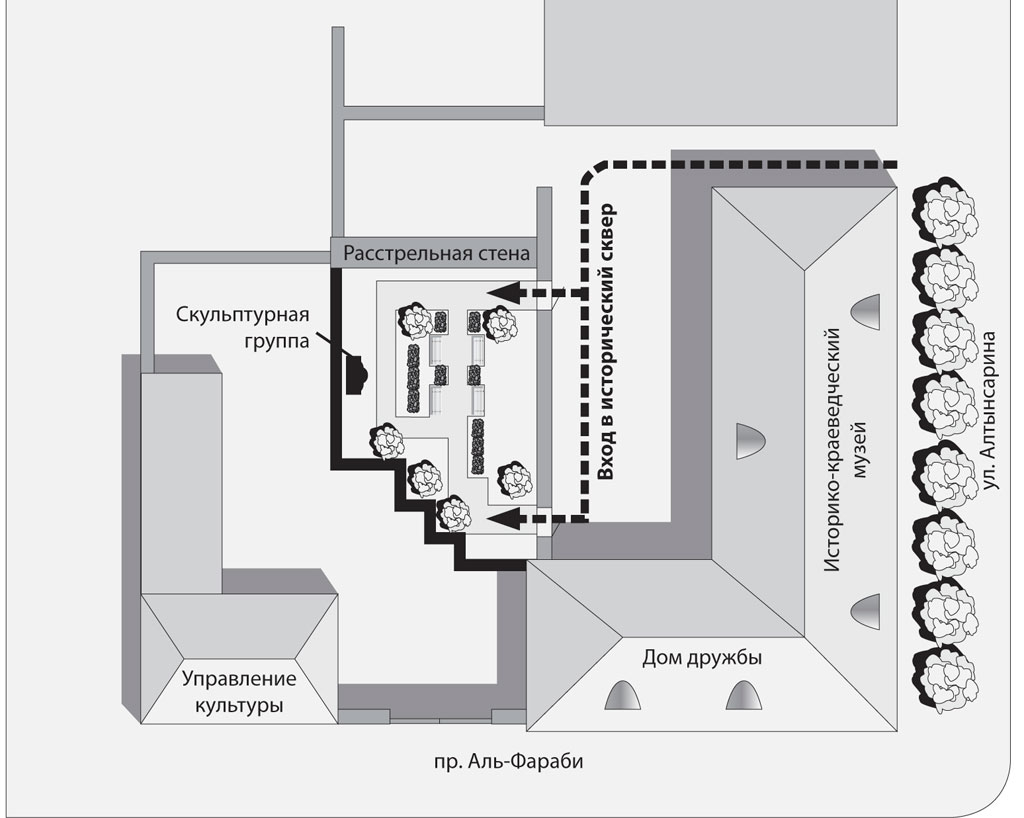 Вход в исторический сквер будет расположен со стороны ул. Алтынсарина. Памятник погибшим в Гражданской войне, который сейчас стоит у расстрельной стены, будет располагаться напротив входа в сквер. Сауле Бурбаева также сообщила, что в будущем часть территории сквера будет отдана полноценной экспозиции под открытым небом: в запасниках музея есть экспонаты, которые можно выставлять на улице.