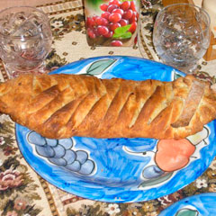 Делается из слоеного теста. Можно сделать самим, но сейчас и готового полно, и очень приличного качества. Начинка с изюминкой - точнее с грибами. Рыба с ними - популярное сочетание для старинной русской кухни. Но главное - форма пирога.