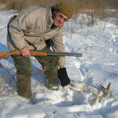 В один из недавних замечательно солнечных безветренных и слабоморозных ( -12 градусов) дней встречаю на охоте Владимира Конюхова. Он выезжает «на зайца» почти каждую неделю, и почти каждую неделю без зайчатины домой не возвращается. Делится впечатлениями о нынешнем сезоне, радуясь тому, что зайцев ныне много, что они добро упитаны, что снега негусто, а потому можно почти без проблем ходить по следу. Разговаривая, косится на заячью тропу и вдруг, перебивая себя, заключает: «Совсем рядом здесь заяц залег, пройдусь, посмотрю...» В его рюкзаке один зайчик уже отдыхает, огромный, килограммов на 5 потянет.