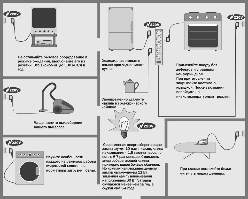 При неправильном подборе осветительных приборов и использовании устаревшей бытовой техники энергии тратится на 50% больше. Если холодильник будет стоять в комнате или месте, где температура достигает 30 градусов, то потребление энергии удвоится.