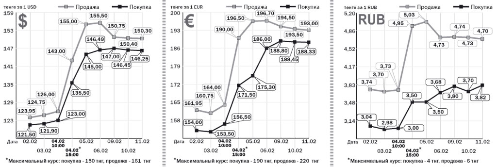 Средний курс валют в обменниках Костаная со 2 по 11 февраля. По данным ФКФ «Контанго»