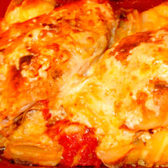 Продукты слегка посолить сверху и поперчить черным перцем. Посудину поставить в разогретую до 200 градусов духовку на решетку, чуть ниже среднего уровня. Запекаться грудки будут примерно полчаса. Через полчаса натираем на терке любой твердый сыр и щедро посыпаем блюдо. Я - в отличие от автора рецепта - самые выдающиеся части грудок слегка смазала майонезом и под сыр сыпанула малость сухих пряных трав, розмарин с чем-то еще. Запекаем еще примерно 15 минут до золотистого цвета. Получается нежное сочное мяско, которому как раз сыр не дал пересохнуть, и картошечка, запеченная в сливках - один из самых вкусных гарниров.