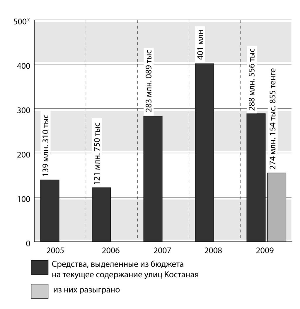 На сайте акима Костаная в разделе ЖКХ, куда нас отправил за информацией начальник ГУ «Отдел ЖКХ, пассажирского транспорта и автомобильных дорог акимата Костаная» Роман Канава, в графе «Текущее содержание улиц и мест общего пользования в Костанае» в 2009 году указана сумма в 288 556 000 бюджетных тенге. Однако пока между пятью подрядчиками - ТОО «Костанай Зеленстрой» (северная часть), ТОО «АБЗ плюс» (восточная, южная, западная части), ТОО «Таза жол-2030» (центральная часть, частично КСК), ТОО «Коммерческая фирма «Шебер» (площадь Байтурсынова) и ТОО «Вескор» (Костанай-2) - разыграно 274 155 000 тенге.