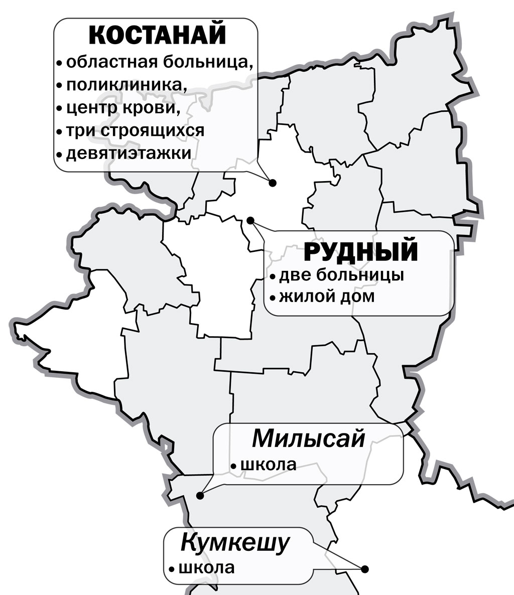 3,5 млрд тенге планировалось потратить на строительство пяти объектов здравоохранения Костанайской области. Однако уже в конце 2008-го депутат сената Парламента РК Евгений АМАН заявлял, что «реально освоить до конца года только 2 миллиарда тенге». Похоже, что не освоили даже и эту сумму.