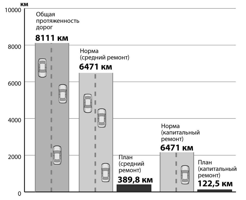 Если говорить о дорогах местного значения, то заместитель начальника управления пассажирского транспорта и автомобильных дорог акимата Костанайской области Андрей ГОВАРТ на недавней сессии областного маслихата заявил, что 55% дорог имеют дефекты и находятся в стадии разрушения. По нормативам межремонтных сроков нужно ежегодно делать капитальный ремонт 722 км дорог, а средний - 2157 км. Фактически даже на ближайшие 3 года запланированы средства лишь на 122,5 км для капитального ремонта и реконструкции и на 398,8 км для среднего ремонта. На эти цели предполагается истратить около 11 млрд тенге. Представляете порядок цифр, чтобы привести в порядок все дороги Костанайской области?