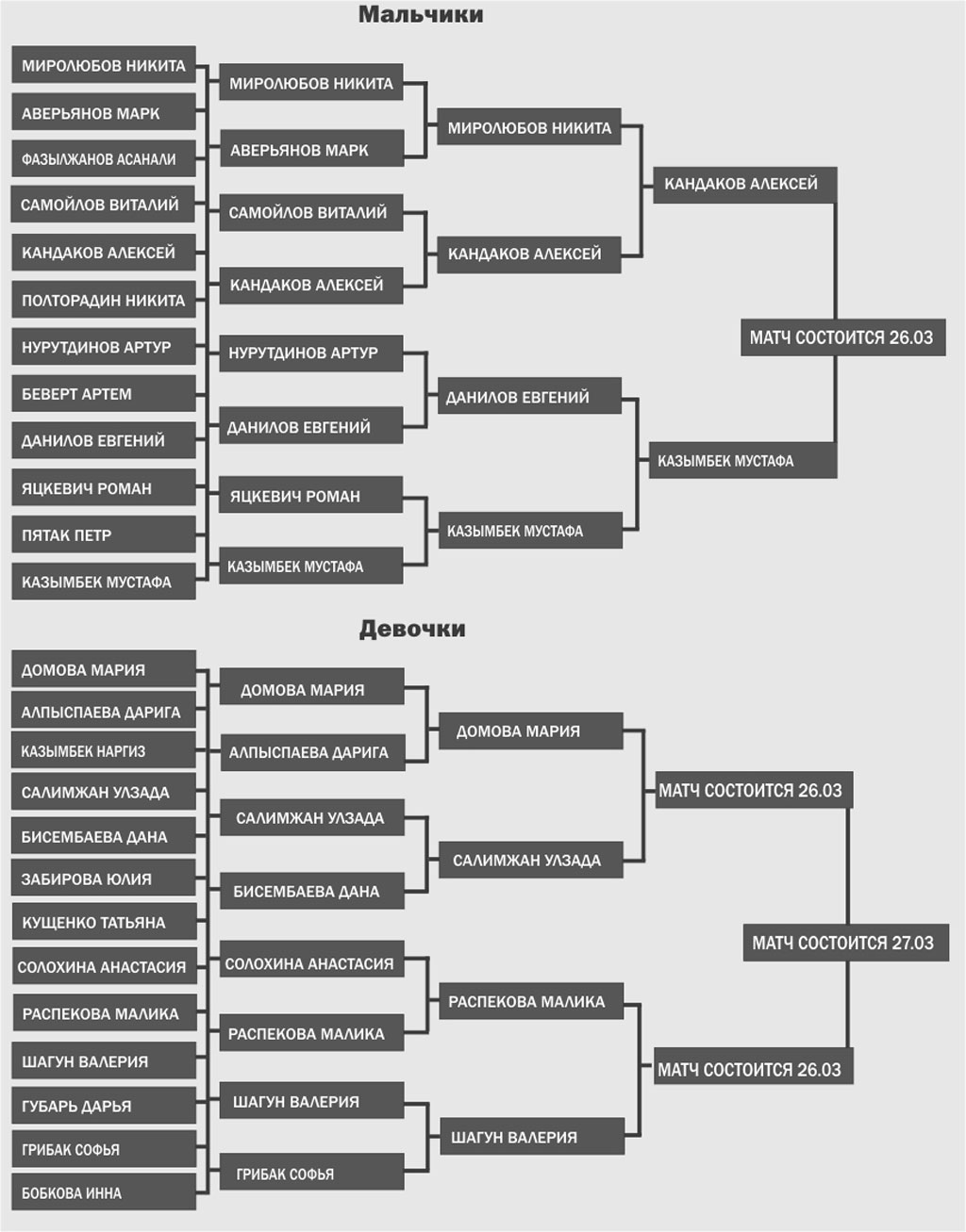 Среди девушек под первым номером посеяна Мария Домова, под вторым номером - София Грибак, под третьим - Малика Распекова, под четвертым - Олзада Салимжанова. По прогнозам тренеров, между этими ребятами и должна развернуться основная борьба за призовые места.