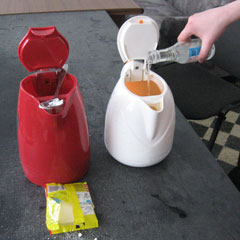 Ставим чайник кипятиться. После автоматического отключения оба электрочайника оказываются чистыми и без единого следа накипи на дне. Однако резкий запах уксуса при открытии крышки второго чайника режет даже глаза. Быстро выливаем смесь.
