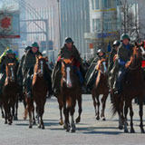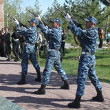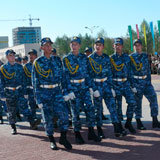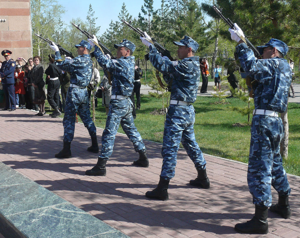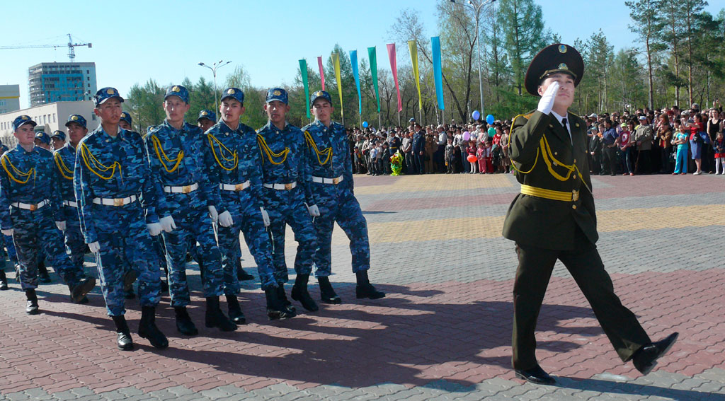 Каша - давно уже непременный атрибут празднования. Как и то, что костанайцы называют парадом. Когда по брусчатке перед облакиматом чеканят шаг немного военных и много силовиков. Форма у всех разная - зрелище пышное.