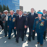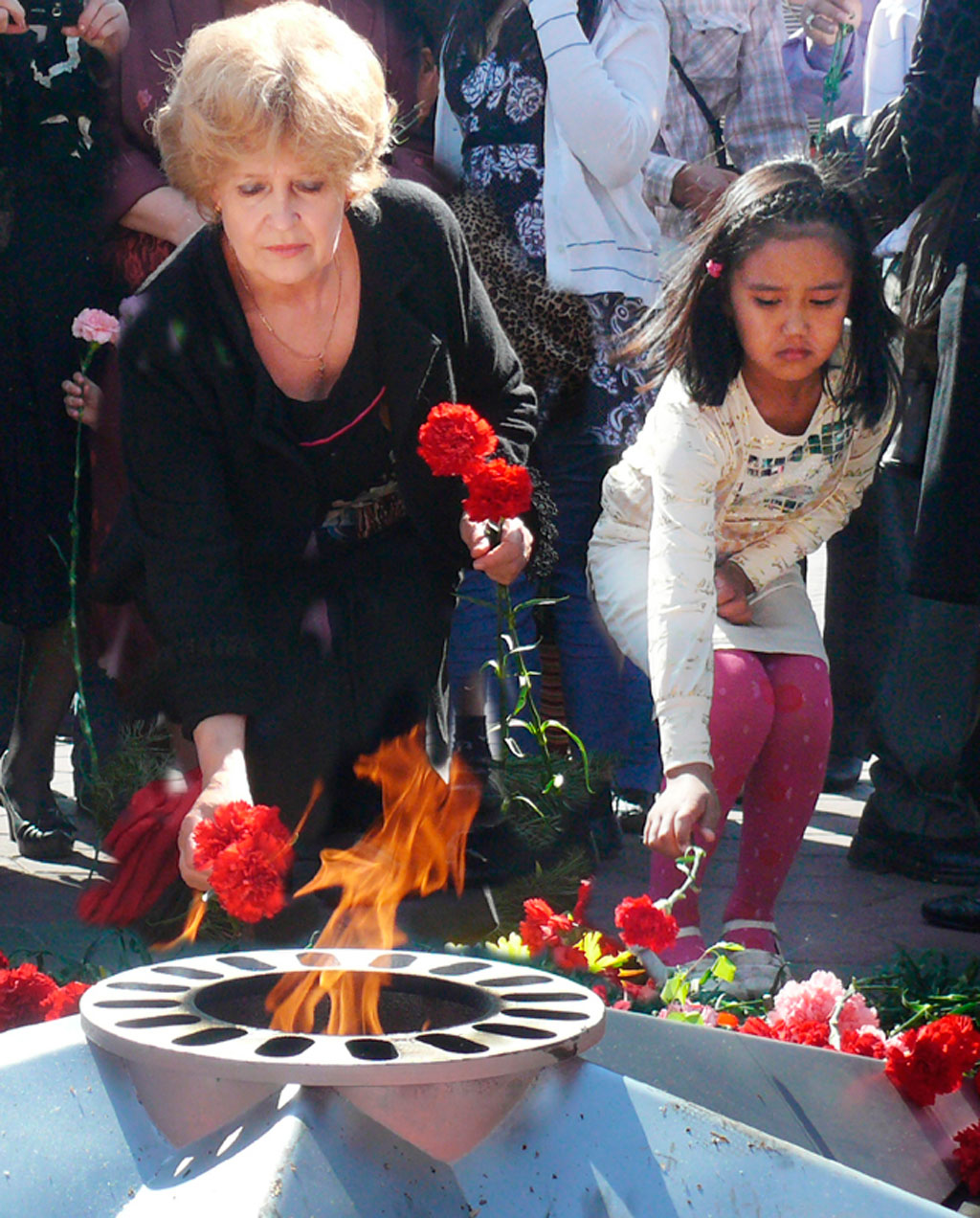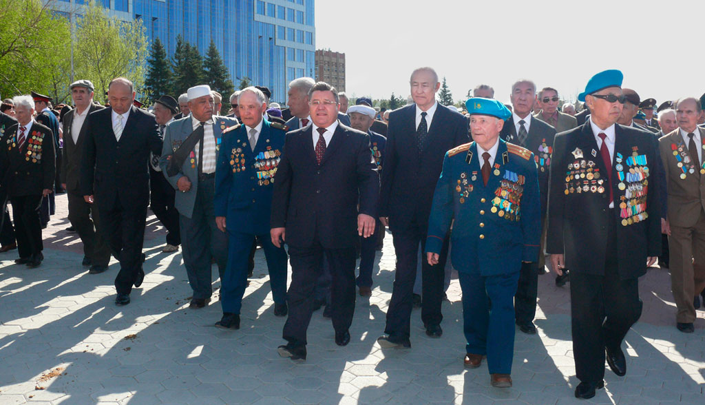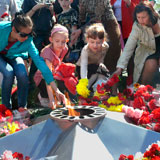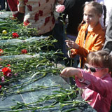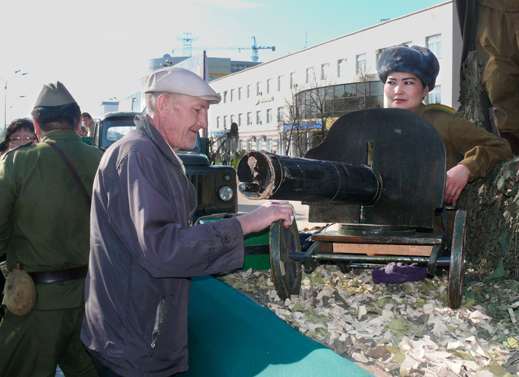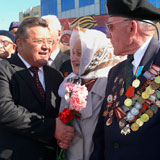 С каждым годом 9 Мая становится все более театрализованным. Наверно, это неизбежно. В Костанае постановщики постарались: выставка старого оружия около музея, бойцы в плащ-палатках, красавица в военной форме, похожая сразу на всех героинь-казашек той войны, строгая графика постановочных сцен, и везде - капли красных гвоздик. В парке Победы у Вечного огня многие плакали. Мужчины и женщины. Пожилые и совсем молодые. Людская река текла и текла по широкой аллее, дети тянулись к пьедесталу с букетами. И это были самые трогательные минуты дня, когда еще можно было расслышать поминальную ноту, без которой 9 Мая и представить нельзя. Оно ведь и праздником стало только с 1965 года. А до этого был день скорби и памяти.