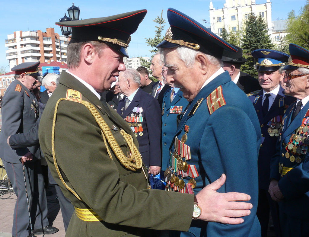 - Святой праздник, - говорит начальник департамента по ЧС полковник Евгений БАТОВ, обнимавший на площади полковника Александра ТЕПЛОВА. - Александр Николаевич - ветеран из ветеранов. Служил в разведке, командовал ротой в Японии, создавал ракетный щит Родины... А праздник действительно особый, мы и от себя фронтовиков поздравляли, подарки делали.