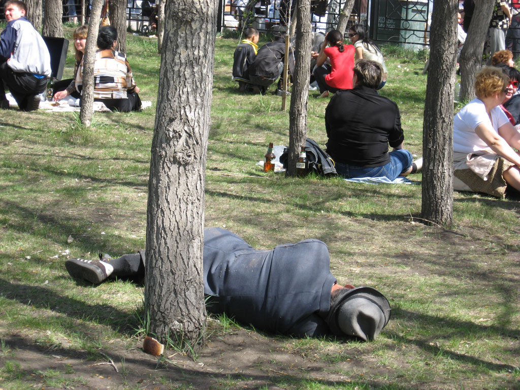 ...Всегда хочется, чтобы вот тут, у Вечного огня, организованная часть праздника и завершилась. Но потом наступает черед санкционированных народных гуляний. Разрешено пить водку там, где в обычные дни лишний раз пройти нельзя. Все парковые газоны превращаются в место грандиозного пикника. И песни звучат вполне удалые. Уже и не важно становится, за что пьем. За «этих, как его, дедов и отцов», объясняли веселые парнишки, полируя водку пивом. На вопрос, кто все-таки в их семьях воевал, один вспомнил имя прадеда, а другой не смог. Не такая уж редкость, кстати. Зато чокался народ за мир во всем мире горячо и искренне.