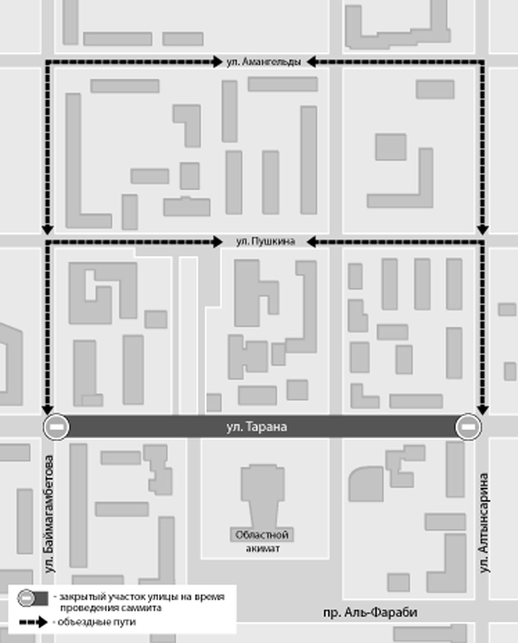 Утром 12 июня, как пояснил Рымарев, на 3-4 часа закроют ул. Тарана на отрезке от ул. Баймагамбетова до ул. Алтынсарина - на время проведения заседания Совета иностранных инвесторов в купольном зале филармонии. Объезд будет совершаться по ул. Амангельды и Пушкина.