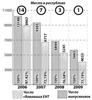 Всего в области приняли участие в ЕНТ 4033 из 5665 выпускников. Если сравнить с показателями за последние 4 года, динамика налицо: число выпускников уменьшается, процент принимающих участие в ЕНТ снижается, средний балл повышается. Напомним, что в 2006 году Костанайская область заняла только 14 строчку в рейтинге ЕНТ. Для исправления ситуации потребовались решительные меры.