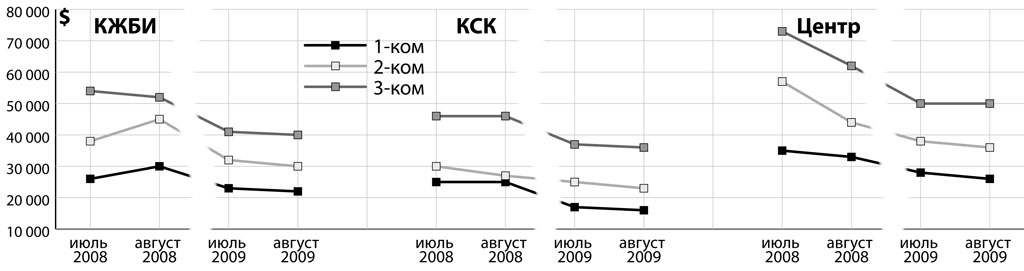 Сравнительный анализ цен на жилье на вторичном рынке Костаная мы проводили, исследуя объявления в газете «Твой шанс». Цифры впечатляющие. Если в середине августа 2008 года средняя цена на однокомнатную квартиру в центре равнялась 33 000$, то к этому августу она упала до 26 000$. Существенное падение наблюдается и на двух-трехкомнатные. Если еще в прошлом году 3-комнатную в КЖБИ можно было приобрести за 52 000$, а на КСК - за 46 000$, то в этом за «трешку» в КЖБИ просят 40 000$, а на КСК - всего 36 000$.
