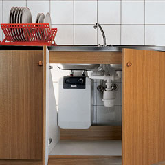 Непосредственно под мойкой часто размещают так называемые безнапорные проточные водонагреватели с гидравлическим управлением (на основе дифференциального реле давления) и ТЭНами для нагрева воды. Подключать их к обычному смесителю, а также каким-либо образом перекрывать выходной патрубок этих агрегатов категорически запрещено. Ведь прибор не рассчитан на давление водопроводной сети, и его просто разорвет или выйдет из строя нагреватель. Поэтому у безнапорных водонагревателей обычно есть свой кран на входном патрубке, регулирующий расход и, как следствие, температуру воды, а также собственный излив, направляемый в раковину.