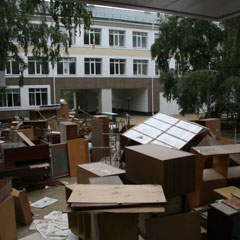Первое ощущение, что школа просто облеплена строителями. Меняются рамы, передвигаются верстаки, разводится цемент. Повсюду трут, красят, белят, моют.