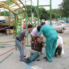 Корреспондент «НГ» уже через 15 минут был на месте происшествия. На асфальте у карусели лежал человек в луже крови, ему оказывала помощь бригада «Скорой помощи». Еще один пострадавший уже лежал на носилках внутри «скорой», вокруг него хлопотали медики. Недалеко на камнях сидели еще двое пострадавших, держась за головы, между пальцами сочилась кровь. Рядом валялись разбитая вагонетка, фрагменты ограждения, обломки колеса карусели, чьи-то туфли. Посетителей в луна-парке в этот день было немного.