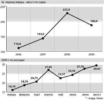 Информация из управления экономики и бюджетного планирования акимата Костанайской области подтвердила, что объем производства по региону вырос с 16 198 млн тенге в январе до 29 466 млн в августе. Причем такая динамика наблюдалась как в обрабатывающей промышленности, так и горнодобывающей, доля которой в экономике области составляет более половины. Правда, если оценивать только в денежном выражении, то у горняков в мае-июне опять был спад, и хотя потом пошел подъем, но в августе они еще не достигли уровня апреля.