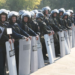 На все вопросы корреспондента «НГ» о характере проходящих учений присутствующие официальные лица предпочитали отмалчиваться. Затем корреспондента вообще попросили удалиться, ссылаясь на то, что гражданским лицам здесь быть не положено. Впрочем, все происходящее очень напоминало учения по противодействию массовым беспорядкам.