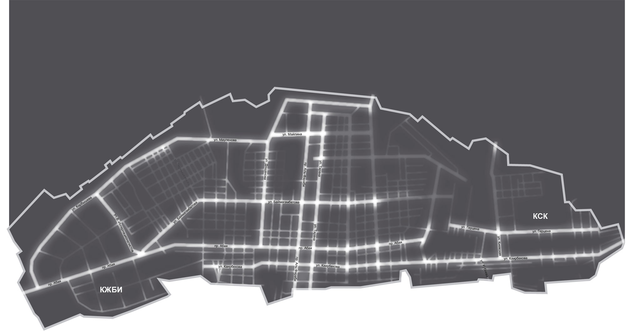 После этого вновь погружаемся во тьму, следуя по ул. Каирбекова в сторону района КСК. На Каирбекова фонари не горят от ул. Тарана до Гагарина. Затем видится просвет, который заканчивается, как только мы сворачиваем на ул. Красносельскую. Здесь освещен только магазин с названием «Далина». Выезжаем на ул. Кубеева, которая вся в ярких огнях. А соседствующий с ней п. Корейский создает контраст своей чернотой.