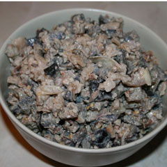 Для четверых взрослых человек вполне хватит 2 кг баклажанов. Снимаем с «синеньких» шкурку и режем их небольшими кубиками. Кладем порезанные баклажаны в глубокую посудину, солим и даем выйти горечи. Забываем о баклажанчиках на часок, после чего хорошенько отжимаем их и опускаем в кипящую воду. Можно попробовать один кусочек на вкус: если соли недостаточно, то воду нужно досолить. Варим их до готовности, затем откидываем на дуршлаг. В казане или в глубокой сковороде распускаем сливочное масло. И тут, как говорит мой папа, чем больше будет масла в блюде, тем оно получится вкуснее. Так что баклажаны маслом вы уж точно не испортите.