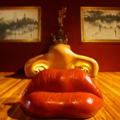Визитная карточка музея - гостиная Мэй Уэст. Ты заходишь в полукруглую комнату, видишь симпатичный диван в форме женских губ, камин, фотографии на стенах. Разум, напуганный предыдущими экспонатами, начинает немного успокаиваться. Ну вот, ничего страшного, просто небольшая очередь ведет к лестнице, где тебе предлагается взглянуть на комнату через уменьшительное стекло. Ты вскарабкиваешься на горб верблюду и утыкаешься носом в стекло. И вдруг видишь... девичье лицо: шторы превращаются в гигантские блондинистые парики, камин в нос, в ноздрях которого пылают дрова, диван-губы воссоздает подлинник с ужасающей точностью. А картины, которые еще минуту назад изображали очертания парижских улочек и Эйфелевой башни, пялятся на тебя беззастенчивыми глазищами американского секс-символа 30-х. Кстати, спустя 50 лет после создания знаменитый диван был продан на аукционе Sotheby's за 90 000 евро.