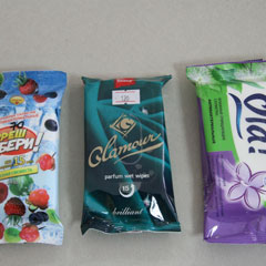 На ощупь все три приятны по качеству, мягкие и влажные. Если их подвергнуть умышленному растяжению, более всего деформируется №1, становясь похожей на влажную туалетную бумагу завода Набережных Челнов. Проверив в Интернете, являются ли составляющие пропитки салфеток опасными веществами, мы были приятно удивлены: нет, если их, конечно, не употреблять в пищу в больших количествах.