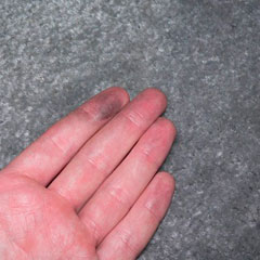 Потом идет влажная чистка. Постелите внизу пластиковую пленку и промойте грязные поверхности теплой водой, в которой растворено немного обезжиривателя, не жалея раствора и применяя губку, ветошь или жесткую щетку. Ополосните чистой водой и вытрите насухо. Если надо, повторите процедуру. Если после неоднократного мытья останется маленькое пятно, осторожно обработайте его уайт-спиритом на ватных тампонах, которые делайте, плотно обматывая ватой конец деревянного шампура. Они лучше покупных тампонов, поскольку уайт-спирит может размягчить их пластмассовые палочки. Слегка смочив тампон в уайт-спирите, без нажима прокатывайте им по поверхности. Не трите - можете загнать сажу в микротрещины.