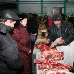Чего не скажешь об очередной сельскохозяйственной ярмарке. Огромные очереди у мясных прилавков, средняя цена баранины - 600, конины - 800, говядины - 500, свинины - 550 тенге. Официально ярмарка начинает работать с 10:00, но и продавцы, и горожане приходят во Дворец спорта гораздо раньше. И в 10 часов лучшие куски уже проданы, прилавки пустеют, а очередь плавно перетекает к тем прилавкам, где мясо еще оставалось. Цена на них автоматически повышается на 20-30 тенге за 1 кг. К 11 часам все мясные прилавки опустели, но многие покупатели так и ушли ни с чем.