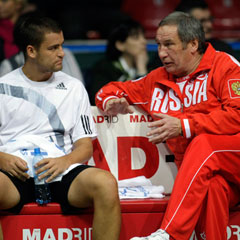 Первыми на корт вышли первые ракетки сборных Индии и России - Сомдев Девварман и Михаил Южный. Первые два гейма достались подающим - обычная разведка позиций соперника с разминкой богатырских плечей. А вот в третьем гейме началось то, что Девварман, вероятно, будет стараться вспоминать как можно реже. На подаче Деввармана 30:15, 40:15 - спокойно как на перемирии. Вдруг Южный рвет дистанцию и выходит к сетке - 40:30. Следует долгий розыгрыш из 10-15 ударов, индиец ошибается справа - 40:40, затем меньше. Опять длинный розыгрыш, Девварман бегает у самого фона, удары Южного беспощадны - Россия повела со счетом 1:2 в первом сете.