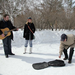 Суббота. 13.00. Корреспондент «НГ» и солист группы «Аквилон» Александр Пономарёв предпринимают попытку внедрения «Арбата на час» в  центральном сквере города. Становимся на центральной аллее. На нас строго зеркалит новая отделка областного акимата. Через 10 минут подготовки и распевок на лавочках появляются бабушки и молодые мамы с детьми. Просят петь громче. Разворачиваем чехол на подтаявшем снегу (для заработка) и начинаем...