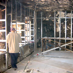Обивка - пластиковая декор-панель - сгорела почти сразу и полностью. Она наполняла кабинет и этаж чёрным удушливым дымом, который, возможно, и стал причиной гибели человека. Частично от пожара пострадал холл первого этажа.