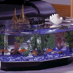 Известно, что классические формы выбирают люди, для которых аквариум - это любимый живой уголок, средство, позволяющее снять напряжение и усталость, избавиться от негативных эмоций. Но бывает, что аквариум заводят совершенно из других соображений. Престижно. Модно. Показатель благосостояния. Яркий декоративный элемент интерьера. Именно в ответ на подобные запросы появились экзотические формы. Например, аквариум-башня - высокий (до двух метров) и очень узкий. Иногда сверху его украшают часами. К сожалению, живые растения не способны существовать в таких условиях, да и ухаживать за башней неудобно.