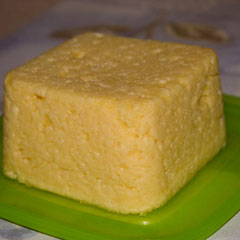 Технология приготовления довольно простая: в алюминиевую кастрюлю вливаете молоко, кладете творог (вот тут подойдет и из обрата), хорошо все размешать, нагревать на слабом огне, пока творог не отделится от сыворотки. Ни в коем случае не давайте кипеть. Выдержать творог под гнетом, потом тщательно перемешать с яйцами, солью, содой и специями. В глубокой толстостенной сковородке растопить сливочное масло и выложить творожную смесь. На среднем огне при постоянном помешивании она должна полностью расплавиться. Только не давайте ей закипеть. Когда застынет, будете иметь достаточно твердый творожно-плавленый сыр. Его можно подкрасить куркумой.