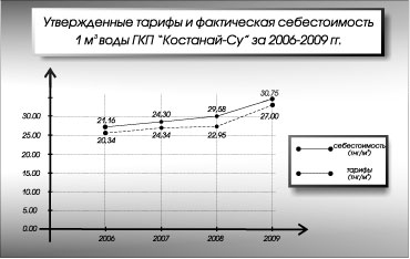 Утвержденные тарифы и фактическая себестоимость 1 куб. м воды ГКП "Костанай-СУ" за 2006-2009 гг.