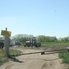 Возвращаемся на трассу, ведущую в сторону Садчиковки, и едем дальше, сворачивая строго направо - где есть съезды, проселки, ведущие к реке. Будущих турбаз больше не встречали, но шлагбаумов видели предостаточно. Одни открыты, но их же всегда можно закрыть. Другие конкретно въезды перекрывают. За одним виднеются поля морковки, на переднем плане стоит бочка с распылителем - с помощью таких спасают обычно свои посадки от вредителей небольшие крестьянские хозяйства, специализирующиеся на овощеводстве. Опять идем спрашивать разрешения на проезд. Получаем его с напутствием, мол, езжайте, но не пылите и шлагбаум за собой закройте.