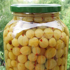 Это заготовка на зиму. Маринованный крыжовник очень хорошо дополняет жареное мясо, особенно гуся или утку. Еще его вкусно добавлять к капусте-провансаль. Делается просто. Подойдет зрелый, но крепкий крыжовник любого сорта. Каждую ягоду надо наколоть иголкой или зубочисткой. Дальше можно поступить по-разному. Залить ягоды холодным маринадом и либо поставить, закрыв капроновой крышкой, в холодильник постепенно "зреть" и набирать вкуса, либо банку с крыжовником 3 минуты (литровую банку) пастеризуют при слабом кипении и закатывают.