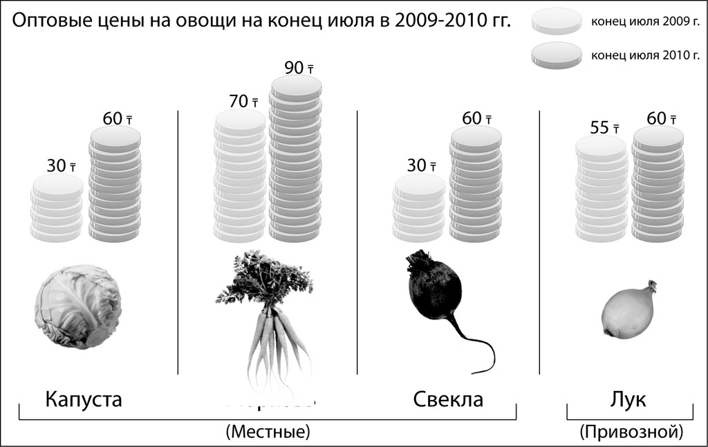 Но если сравнивать с ценами прошлого года, даже подешевевшие овощи все равно подорожали. Как отмечают местные овощеводы, в этом году небывалая цена на капусту. Оптом ее отдают по 60 тенге. А в прошлом году, в конце июля она стоила в 2-3 раза меньше. Свекла в этом году стоит от 60 тенге за килограмм оптом - вдвое дороже, чем год назад. В рознице ситуация такая же.