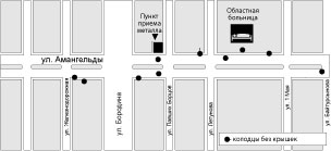 Чуть дальше видим два «закрытых» колодца - один засыпан мусором, другой накрыт деревянным листом. По той же Амангельды возле строящейся областной поликлиники - открытый колодец глубиной 5-7 метров. В пару шагах - еще два без крышек. На перекрестке ул. Амангельды-Байтурсынова колодец добротно закрыт люком, но находится сантиметров на 30-40 выше уровня трассы, чем и вызывает нецензурное недовольство всех водителей.