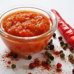 Из помидоров и перца: 2,5 кг болгарского перца, 100 г красного горького перца, 1,5 кг томатов, 150 г чеснока, 250 г винного уксуса, 100-150 г зелени кинзы, соль по вкусу.