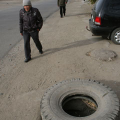 - Я уже 12-й год здесь живу, хожу рядом, - говорит Нияз АХМЕТЗЯНОВ. - Этот колодец возле дома № 166 по ул. Рабочей открыт постоянно. Здесь у нас почтовое отделение, пенсионеры за пенсией ходят. Здесь проходит дорога на оптовку, и этот колодец прямо на пешеходной дорожке стоит. Его уже закрывают добрые люди чем попало, чтобы никто не упал: то ветку засунут, сейчас вот баллоном от КамАЗа закрыли. А недавно увидел еще один открытый колодец, немного дальше - возле дома № 176 «А». Там дети неподалеку играют. Почему никому до этого дела нет?