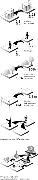 В общеобразовательных учреждениях будут сокращены площади на одного учащегося с 2,5 кв. м до 2,25 кв. м. Площадь рекреации уменьшится с 2 кв. м до 1 кв. м на человека. Ширина рекреационных коридоров станет 2,8 м вместо 4 м. Планирует государство выиграть и на сокращении пришкольной территории, уменьшив ее на 20%. По некоторым данным, для экономии площадей в школах рекомендовано объединять кабинеты химии, физики, биологии и астрономии, а также спортивный зал и зону для начальной военной подготовки. По новым СНиПам в школах не предусмотрены бассейны, помещения для групп продленного дня, кабинеты черчения и изобразительного искусства, помещения для проведения кружков, уголков живой природы, тиры.